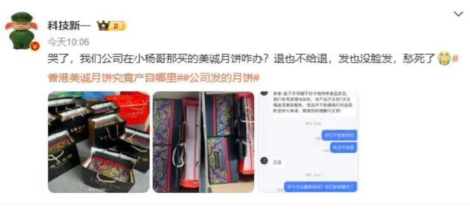 9月14日晚,#老板买到15盒香港月饼哭诉不发了#冲上热搜第一。 老板买到15盒香港月饼哭诉不发了:退也不给退,发也没脸发 据悉,数码大V科技新一发文表示,他助理在小杨哥直播间购买了美诚月饼准备送人,不过该月饼近日被曝光产地非香港,他要求退货,但客服表示,月饼是正品并且属于时令性特殊食品类目,不支持7天无理由退换货服务。 日前,因小杨哥以及三只羊旗下主播力推的香港美诚月饼涉虚假宣传一事引发关注。 小杨哥在直播间声称这款月饼是香港高端品牌,里面是黑松露,还是米其林大师调制的。但产品信息显示,该产品实际产地是在广州和佛山。有很多香港网友表示,根本没有听说过这个品牌,香港流行网购平台也没有这款产品踪迹。 “香港美诚”月饼月销5000万元,三只羊、曾志伟曾为其带货 据《南方都市报》13日报道,中秋临近,“疯狂小杨哥”及其旗下直播间带货名为“香港美诚”的月饼。小杨哥称其系“高端月饼,香港月饼”。有网友质疑,该月饼产地并非在香港。